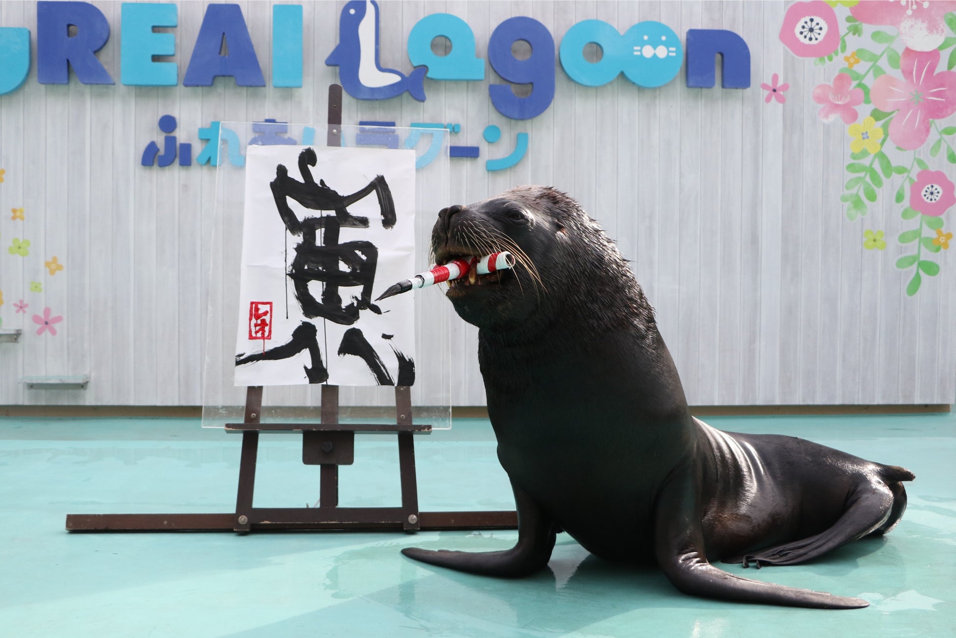「オタリアの書初め」では、新年の平穏と幸せを願い、オタリアが特製の筆を口にくわえ、トレーナーと力を合わせて豪快な文字を書きあげます。