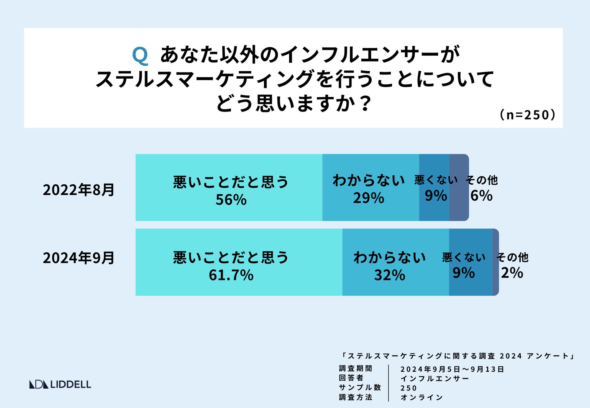 人を基軸としたマーケティング事業を展開するLIDDELL株式会社(本社:東京都港区、代表取締役:福田 晃一、以下リデル)は、当社運営のサービスに登録するインフルエンサー 250名を対象に「ステルスマーケティングに関する調査 2024」を実施致しました。実に 71%のインフルエンサーがステマ規制からの1年で「ステマ依頼」が減少したと回答しており、ステマ規制によって現場にも変化があったことが分かりました。