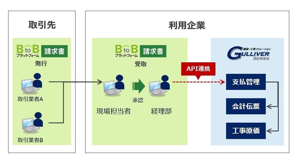 BtoBビジネスを革新する信頼のリーディングカンパニーを目指す、株式会社インフォマート(本社:東京都港区 代表取締役社長:中島 健、以下「当社」)は、当社が提供する「BtoBプラットフォーム 請求書」と、あさかわシステムズ株式会社(本社:大阪府泉佐野市 代表取締役社長:三宅 安幸、以下「あさかわシステムズ」)が提供する建設・工事ソリューション「ガリバー」シリーズが、API連携を開始したことをお知らせいたします。これにより、請求書の受け取りから会計処理の大幅な効率化が可能になり、建設・工事業における経理業務の生産性向上を後押しします。