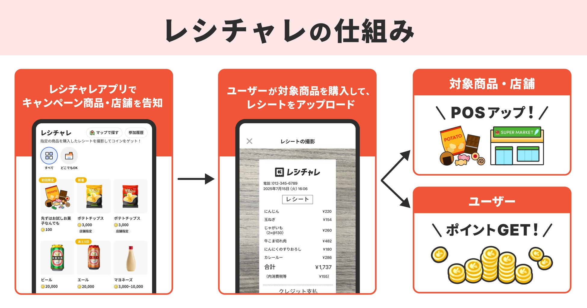 当社提供の節約アプリ「レシチャレ」は、アプリ上にキャンペーン商品を掲載し、アプリユーザーはその商品を購入したレシートをアップロードすることによってポイントが獲得できる仕組みです。