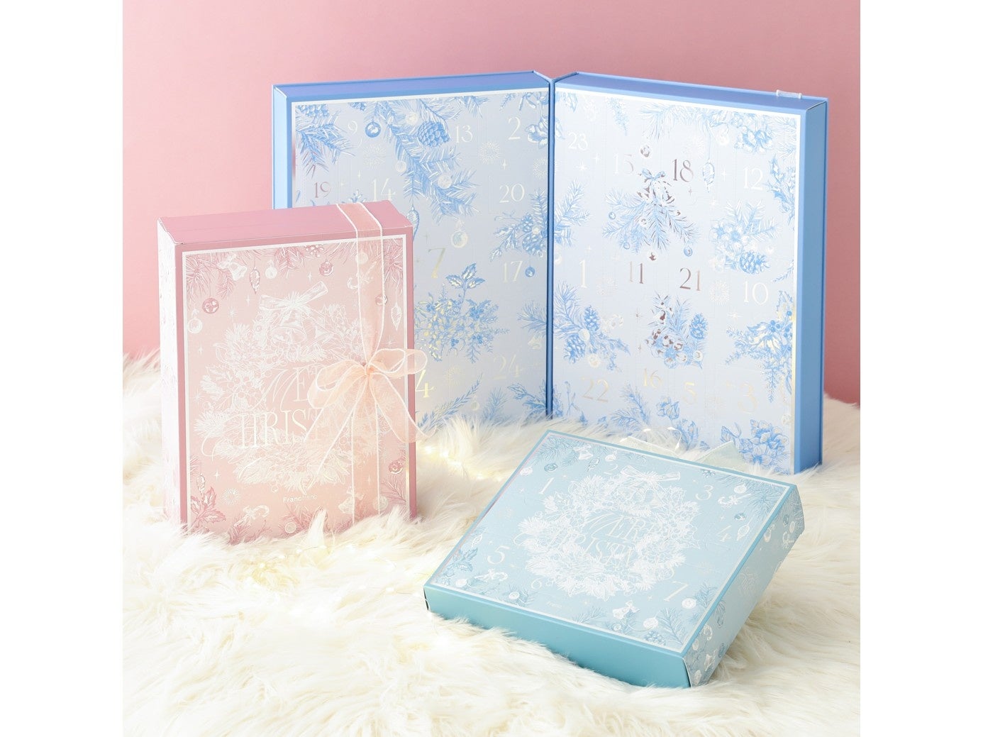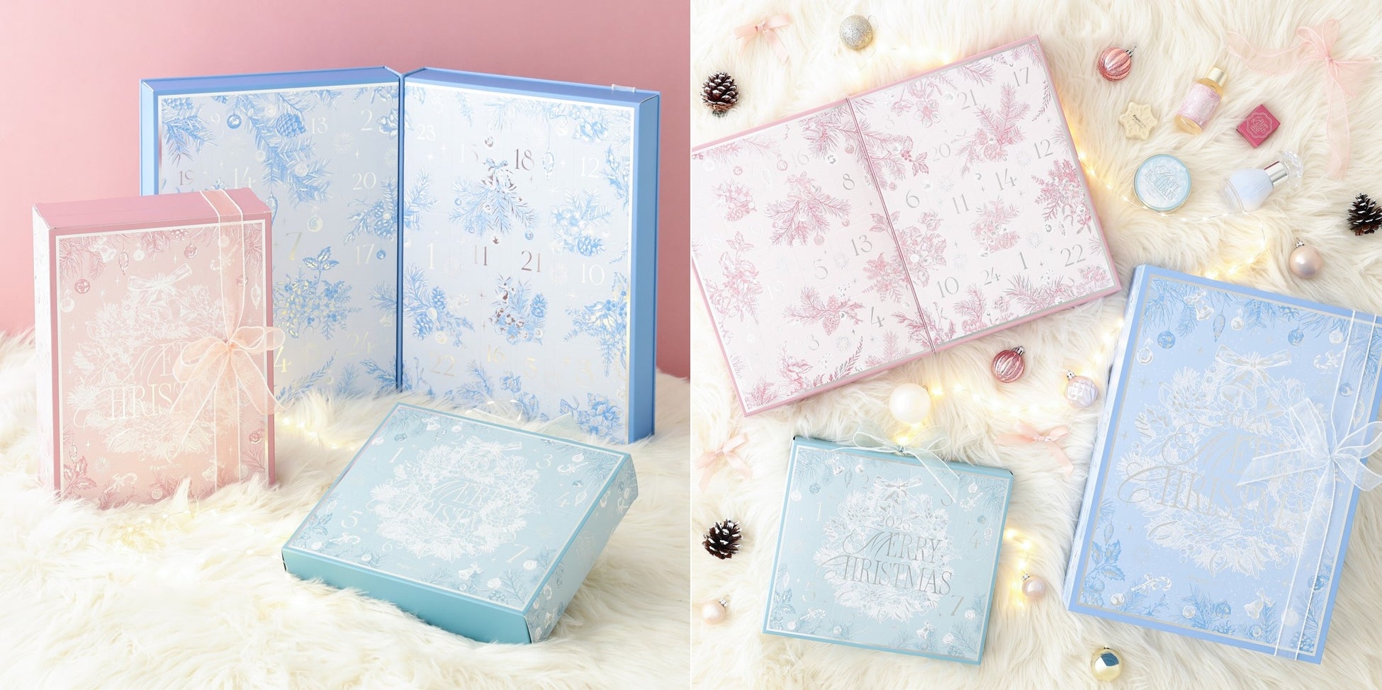 昨年よりデザインを刷新し、パウダリーなパステルカラーと雪のようなキラキラ輝くリボンをあしらい、よりクリスマスらしいルームコーディネートを楽しめるデザインにアップデート。