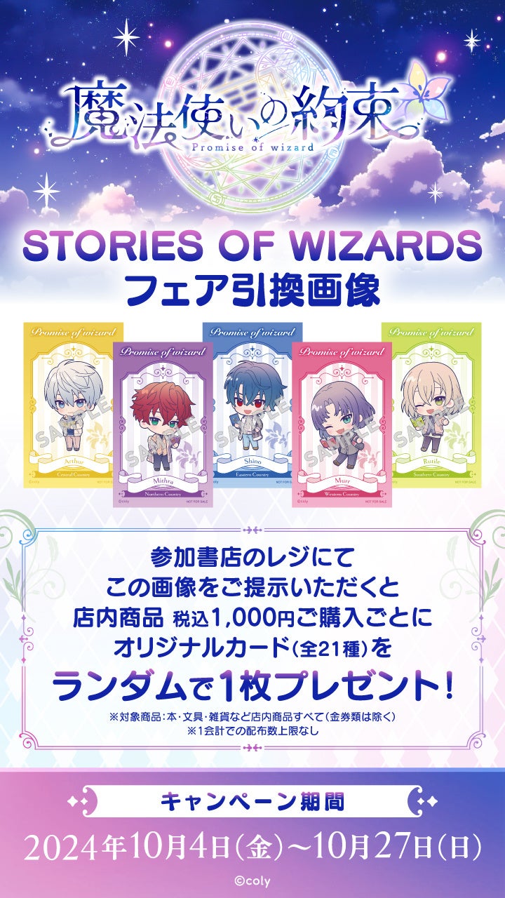 日本出版販売株式会社(代表取締役社長:奥村 景二、略称:日販)は、株式会社coly(代表取締役社長:中島 杏奈)が運営するスマートフォン向けアプリゲーム「魔法使いの約束」とのコラボキャンペーン「魔法使いの約束 STORIES OF WIZARDSフェア」を2024年10月4日(金)~10月27日(日)まで全国の書店501店で開催します。対象書店全店でオリジナルカード(全21種)をもらえるキャンペーンのほか、POP-UPショップとなる18店舗では、オリジナルグッズを販売します。