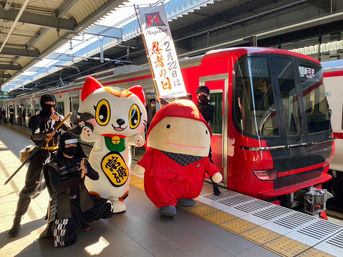 「徳川家康と服部半蔵忍者隊®」となぞの旅人「忍者フー」、常滑市キャラクター「トコタン」による列車のお見送りを実施します。