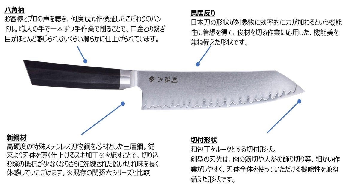 今回受賞した、関孫六ブランドの最高峰シリーズ「関孫六 要」は、日本が誇る刃物産地「関」で培われた刀鍛冶の業とグローバル刃物メーカーである貝印の革新的な技術力が合わさり生まれた、機能美と造形美の高いレベルでの融合を追求した逸品です。特長的なデザイン※である刃の反りは鳥居反り形状と言われ、日本刀の形状が対象物に効率的に力が加わるという機能性から着想を経て設計されています。