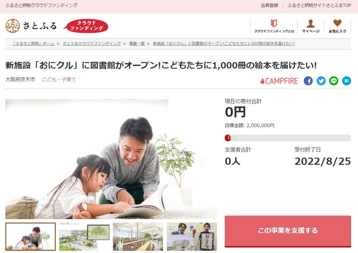 大阪府茨木市(市長:福岡 洋一)とふるさと納税ポータルサイト「さとふる」(https://www.satofull.jp/)を運営する株式会社さとふる(本社:東京都中央区、代表取締役社長:藤井 宏明)は、寄付金の使途に応じて事業を立ち上げ寄付を募る「さとふるクラウドファンディング」(https://www.satofull.jp/projects/top.php)にて、2023年秋にオープンする茨木市文化・子育て複合施設「おにクル」館内の図書館に絵本を1,000冊追加蔵書するため、2022年5月25日より寄付受け付けを開始します。