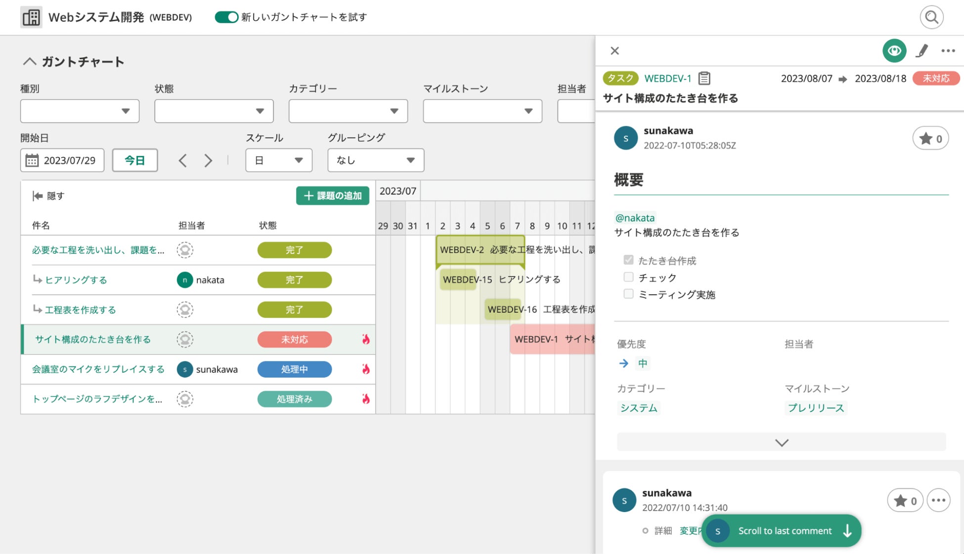今回の機能公開により、新たにサイドパネルが表示できるようになり、ガントチャートを確認しながら課題の内容も確認できるようになりました。他の課題をクリックすると、サイドパネルの内容も切り替わり、関連する複数の課題の詳細を進捗状況と共に把握することが可能になりました。