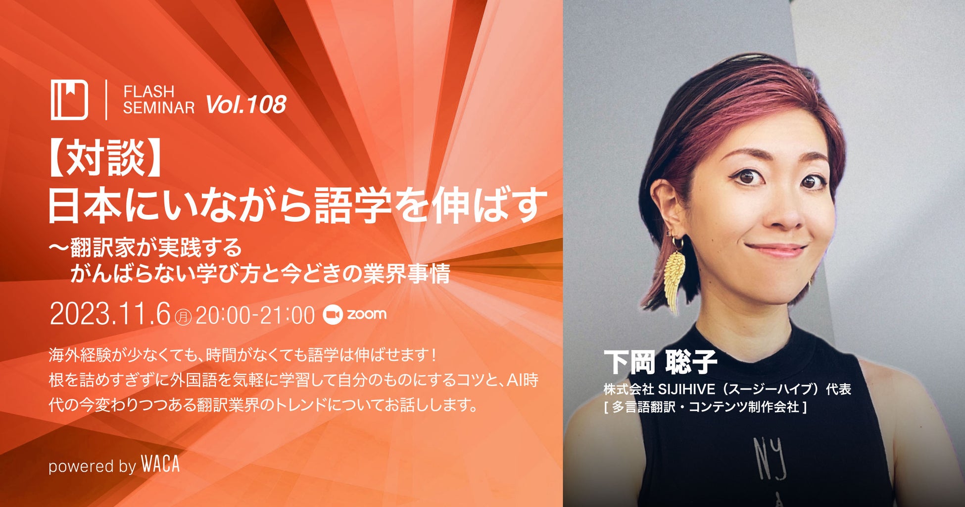 2023/11/6(月)20:00 - 21:00 【対談】日本にいながら語学を伸ばす~翻訳家が実践するがんばらない学び方と今どきの業界事情【Flashセミナー】Vol.108