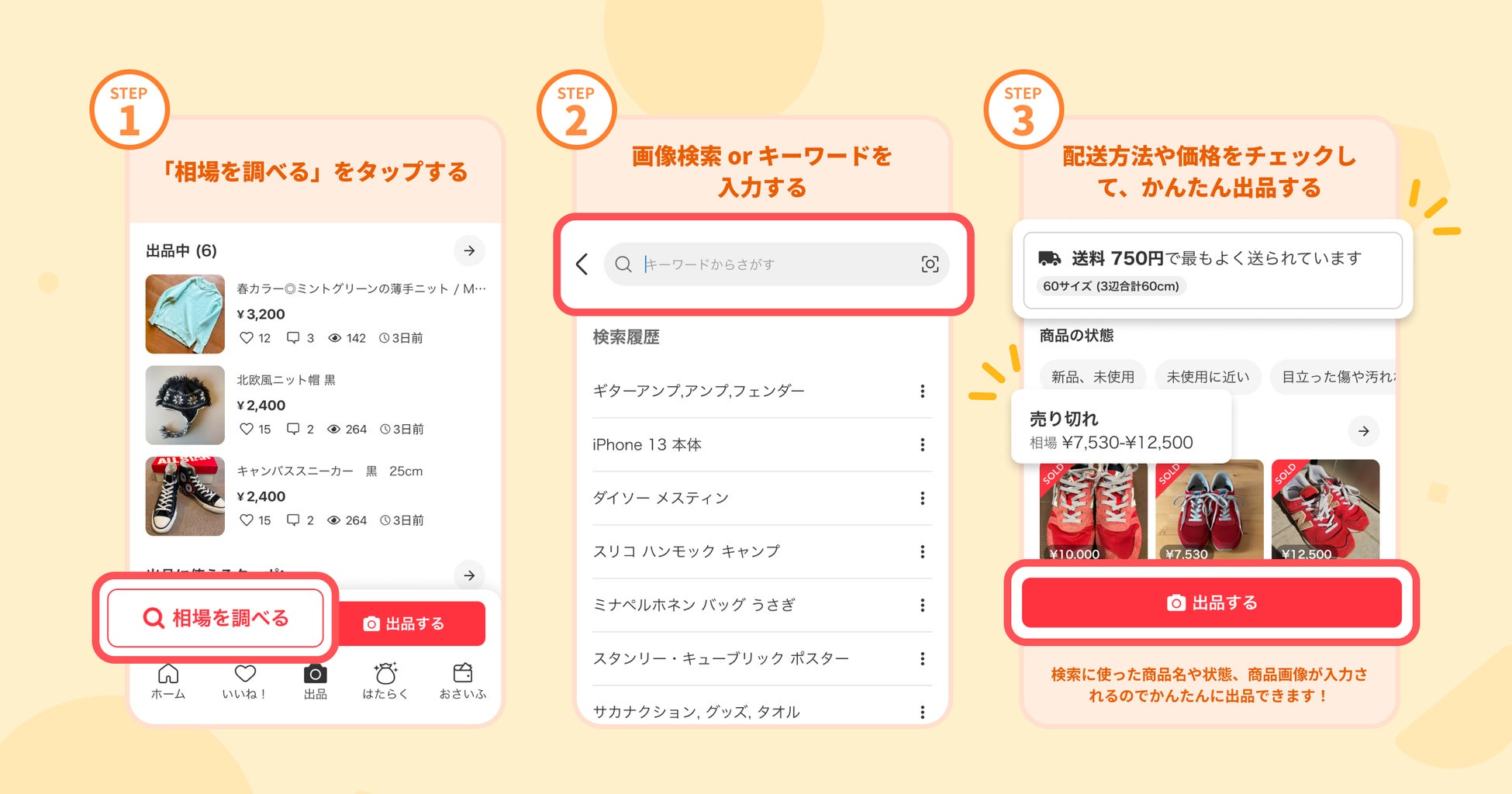 「相場検索」機能は、出品を検討している商品を、画像またはキーワードで検索することで、販売の相場価格(※2)や最も利用されている配送料金をひと目で確認し、そのまま出品に進める機能です。