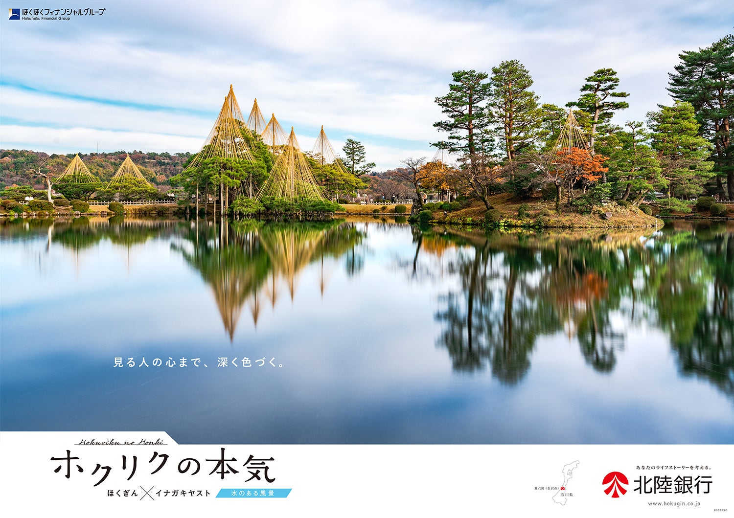 2023年度は「水のある風景」というテーマのもと、各県の「水」に焦点をあてた作品を北陸銀行ポスター等の広告媒体で発信しています。今回は、富山県の「大観峰」と石川県の「兼六園」です。色づく山々と、秋晴れの空と黒部湖の青の対比が鮮やかな作品と、静かな水面に映る紅葉や雪吊りが落ち着いた美しさを感じさせる作品です。