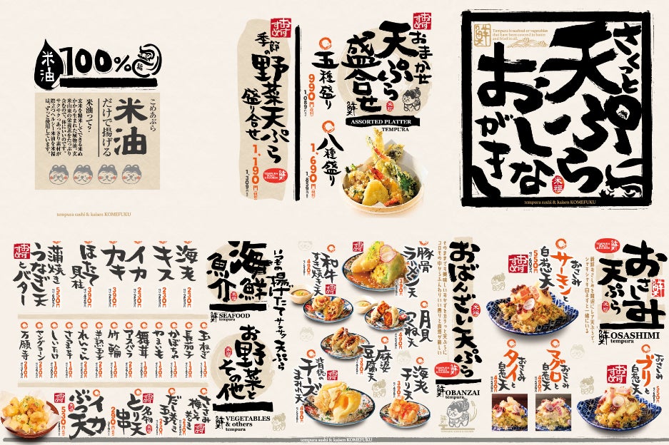 米福の原点である「米油」だけで揚げたサクサク天ぷらや、新鮮なお刺身をそのまま閉じ込めた「おさしみ天」など、オリジナリティ溢れるメニューをラインナップ!