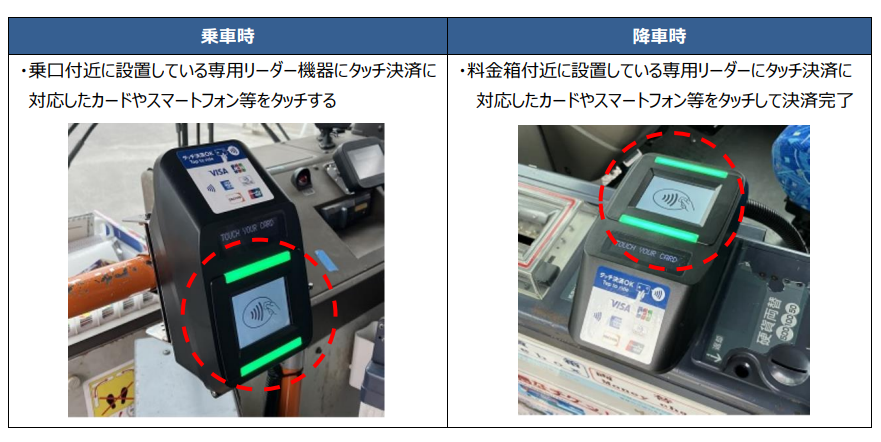 乗降車時それぞれ、車内に設置された専用リーダーにタッチ決済対応カードやスマートフォン等をタッチしていただくことでご利用いただけます。(カリー観光については降車時のタッチは不要)