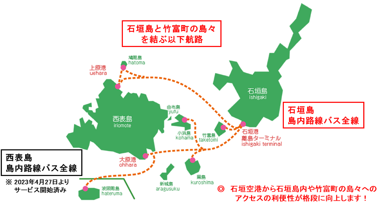 本サービスでは、現金精算や乗船券の事前購入が不要で、お客様がお持ちのタッチ決済対応のカードや同カードが設定されたスマートフォン等を専用リーダーにタッチすることで乗車・乗船いただけます。これにより、石垣空港から石垣港までの路線バスと、竹富町の島々を繋ぐ離島航路の船舶を、キャッシュレスでスムーズにご利用いただけるようになり、八重山エリアに年間約119万人(2023年)訪れる観光客や地元のお客さまの利便性向上が図られます。