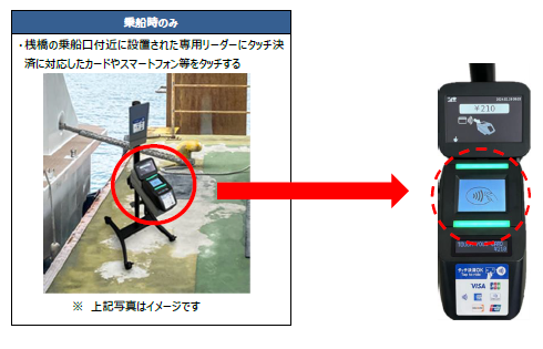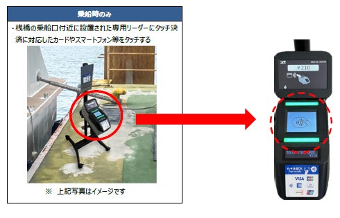 乗船時に、桟橋に設置された専用リーダーにタッチ決済対応カードやスマートフォン等をタッチしていただくことでご利用いただけます。
