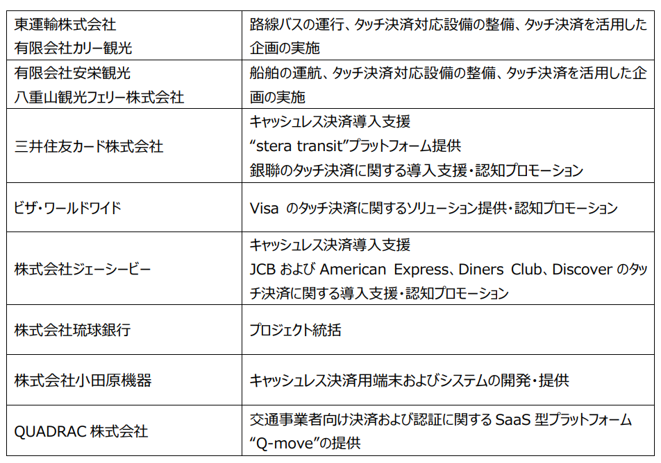 東運輸株式会社(本社:沖縄県石垣市、代表取締役社長:松原 栄松)、有限会社カリー観光(本社:沖縄県豊見城市、代表取締役社長:鹿川 幸正)、有限会社安栄観光(本社:沖縄県石垣市、代表取締役社長:森田 安高)、八重山観光フェリー株式会社(本社:沖縄県石垣市、代表取締役社長:黒島 一博)、三井住友カード株式会社(本社:東京都江東区、代表取締役社長:大西 幸彦)、ビザ・ワールドワイド・ジャパン株式会社(本社:東京都千代田区、代表取締役社長:シータン・キトニー)、株式会社ジェーシービー(本社:東京都港区、代表取締役兼執行役員社長:二重 孝好)、株式会社琉球銀行(本社:沖縄県那覇市、代表取締役頭取:川上 康)、株式会社小田原機器(本社:神奈川県小田原市、代表取締役社長:丸山 明義)、QUADRAC株式会社(本社:東京都港区、代表取締役社長:高田 昌幸)は、2024年3月19日より、八重山エリアの公共交通機関(路線バス、船舶)において、三井住友カードが提供する公共交通機関向けソリューション「stera transit」を活用した、タッチ決済対応のカード(クレジット、デビット、プリペイド)や、同カードが設定されたスマートフォン等による乗車・乗船サービスを開始することについて、以下の通りお知らせします。