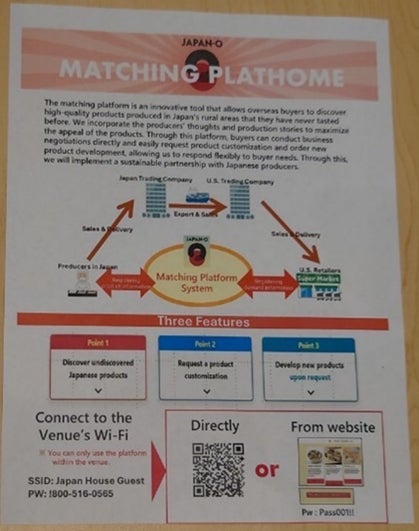 J・MADEとKKT-EPが実施する「冷凍中食でニッポンの『旬』を『瞬』でアメリカ市場へ」事業で実施される米国商談会(9/19ニューヨーク会場、9/25ロサンゼルス会場)において、NTT西日本富山支店が開発した需給マッチングプラットフォーム(ver.1.0)をデモ提供し、商談会に出品される日本の商品を掲載するとともに、米国バイヤーの皆さんにご利用頂き、その使用感等を確認いたしました。