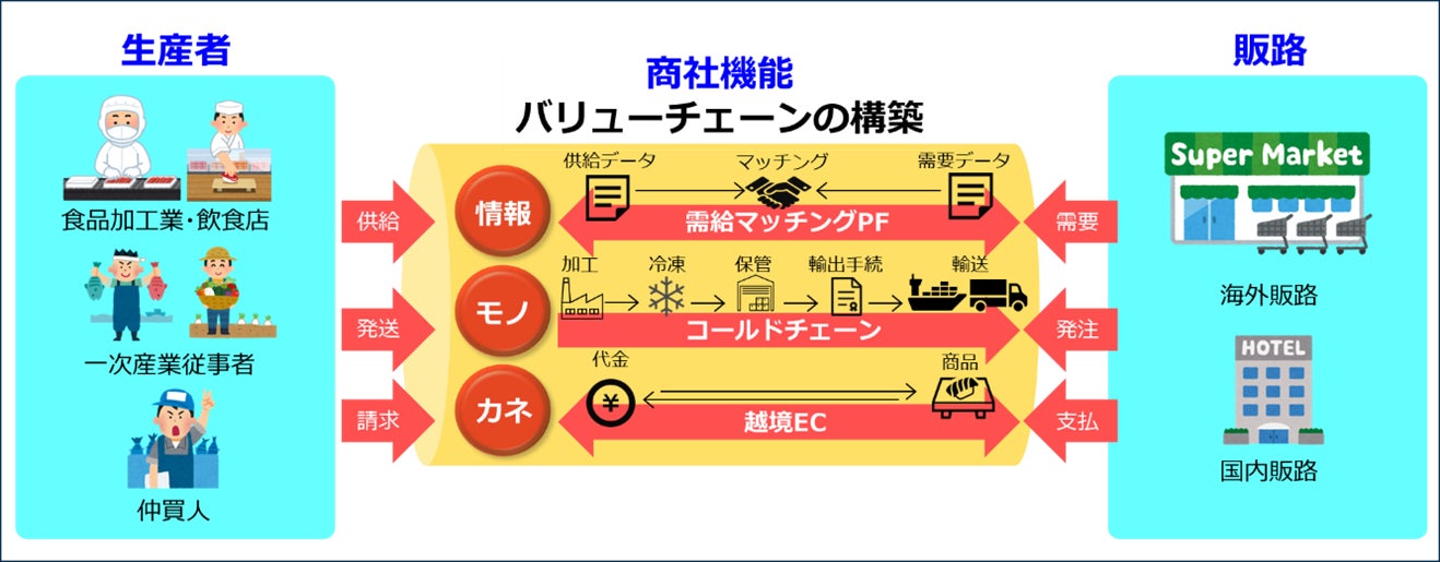 生産者様の抱える、「新しい販路を拡大したいが、どうやって良いか分からない」、「海外販路の開拓をしたいが、海外の商習慣、言葉が分からない」、「海外ビジネスにおいても為替リスクを排除し、日本円での商取引をしたい」といった課題に対し、国内外の商社様ならびに輸送事業者様と需給マッチングプラットフォームが連携することでそれらの課題を解決いたします。