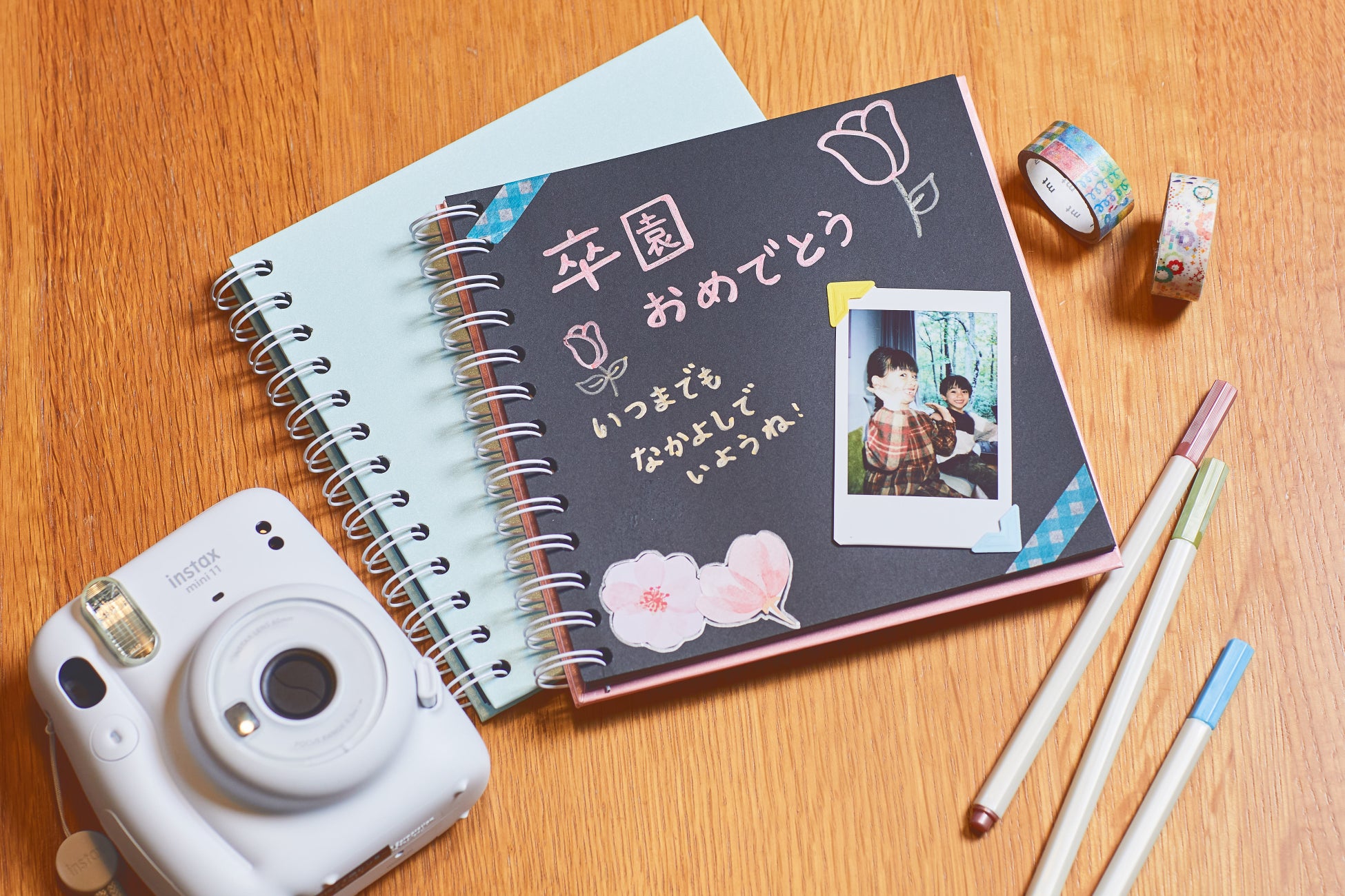 1家族につき1つチェキのレンタルがあり、パーティーや畑での農作業シーンなど、旅の思い出を撮影できます。また、卒園アルバム作成キットを使い、撮影した写真をデコレーションし、世界に一つだけのオリジナルのアルバムを作ることができるのも本プランならではです。