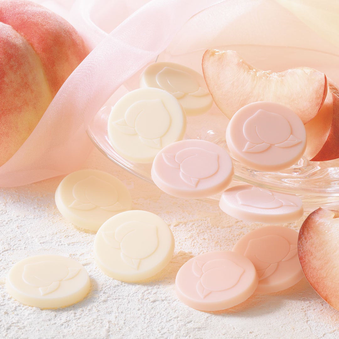 ストロベリーが香るチョコレートに白桃の味わいが広がる[白桃ベリー]と、ホワイトチョコレートが白桃の甘い香りを引き立てる[白桃ホワイト]の2種類のチョコレートをセットにしました。可愛らしい桃の絵柄が入った、ひと口サイズのチョコレートです。