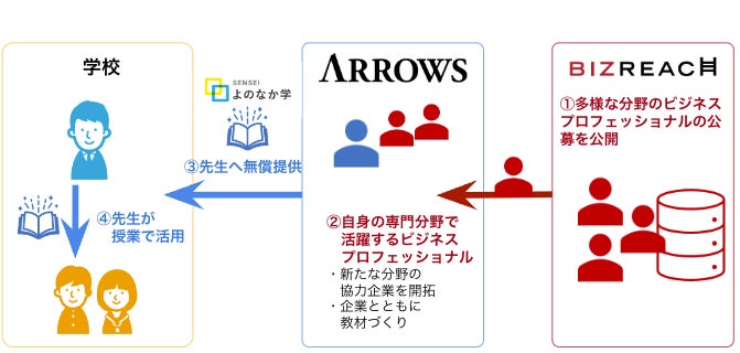 そこでARROWSは、先生向けに提供するサービスのうち、教材を企業と共に作成し、先生へ無償で配布する「SENSEIよのなか学」の教材プロデューサーを、ビズリーチにて副業・兼業という働き方限定で募集します。教材を開発する場に、ビジネスの第一線で活躍するビジネスプロフェッショナルを招き入れることで、多忙な先生を支援し、より多様な「よのなか」を学べる教材づくりが可能になります。副業・兼業という新たな働き方でビジネスパーソンが参画することにより、児童や生徒が21世紀を生き抜くために必要な、リアルな学びを得られる社会を目指します。