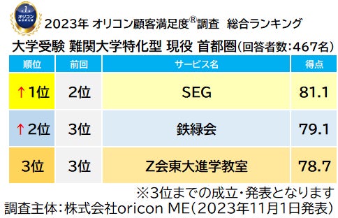 2023年 オリコン顧客満足度®調査 大学受験 難関大学特化型 現役 首都圏
