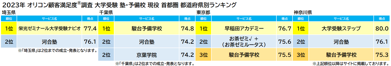 「埼玉県」部門は【栄光ゼミナール大学受験ナビオ】、「千葉県」部門は【駿台予備学校】、「東京都」部門は【早稲田アカデミー】、「神奈川県」部門は【大学受験ステップ】がそれぞれ1位に