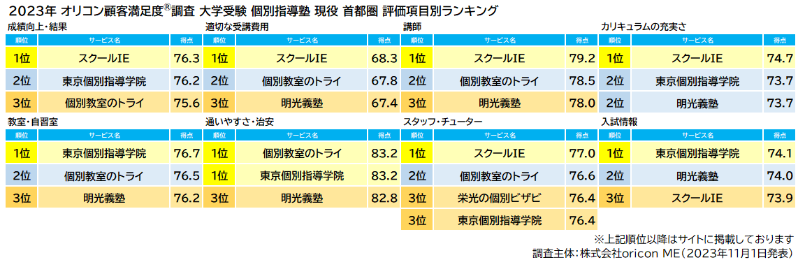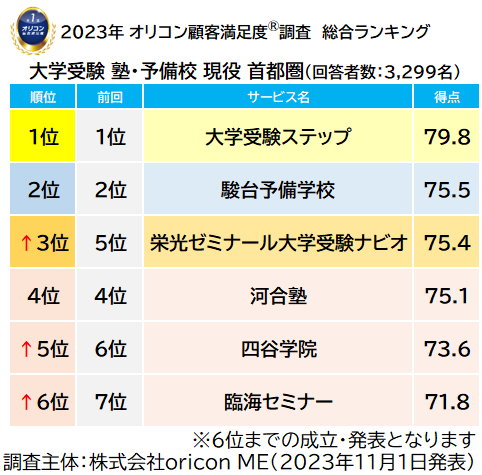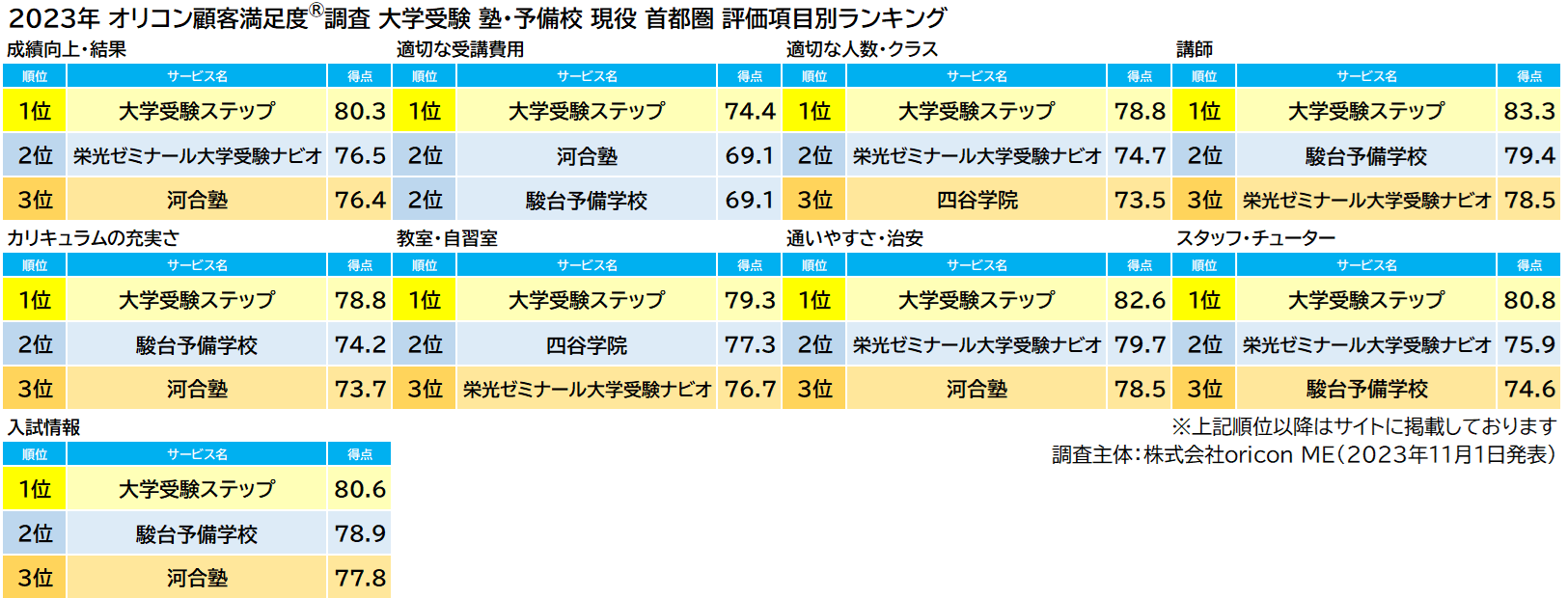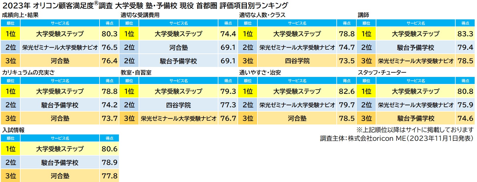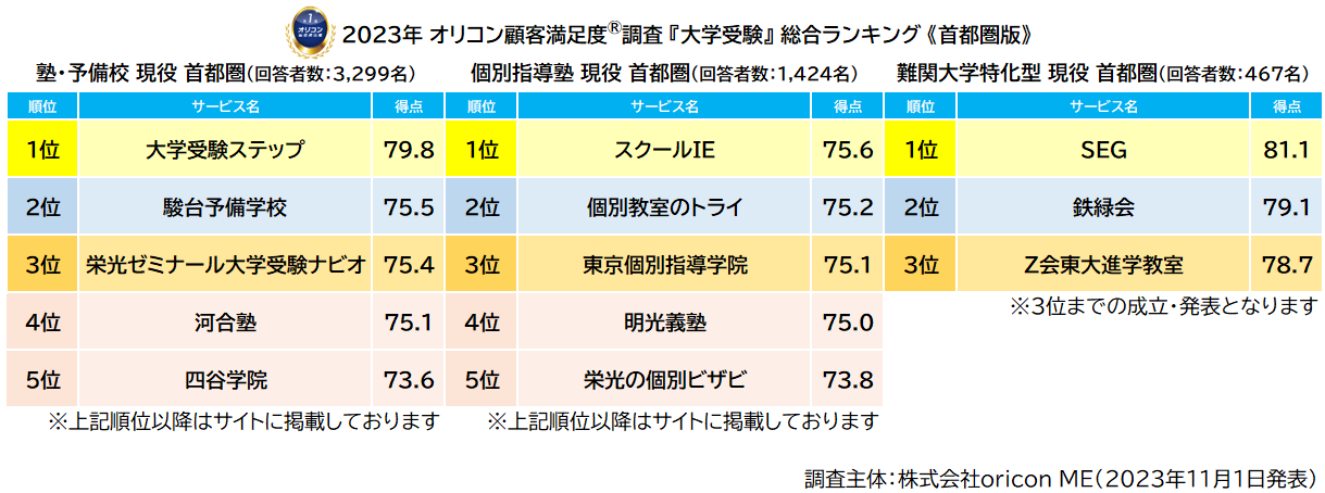 2023年 満足度の高い『大学受験』塾ランキング《首都圏版》|『塾(集団塾)』 は【大学受験ステップ】が6年連続総合1位/『個別指導塾』は 【スクールIE】が4年連続総合1位(オリコン顧客満足度調査)
