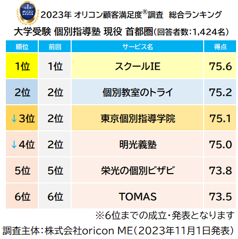 2023年 オリコン顧客満足度®調査 大学受験 個別指導塾 現役 首都圏
