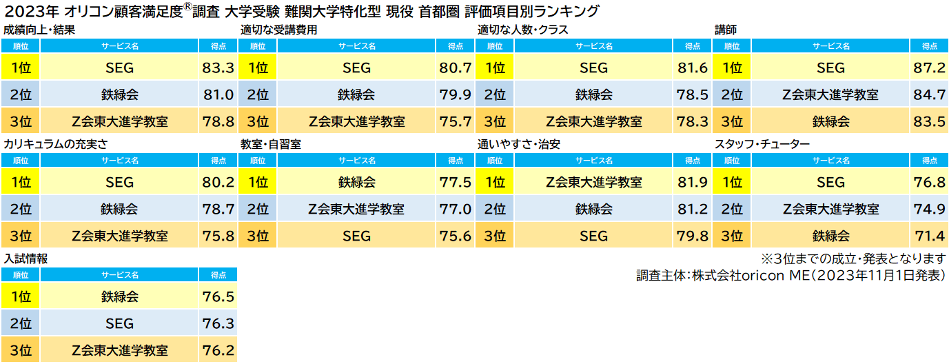 2023年 オリコン顧客満足度®調査 大学受験 塾・予備校 現役 首都圏