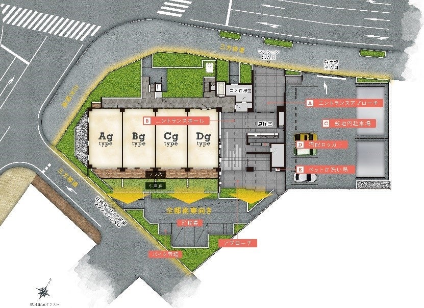 奥行きのあるエントランスアプローチと歩車分離で安全性と快適を追求。