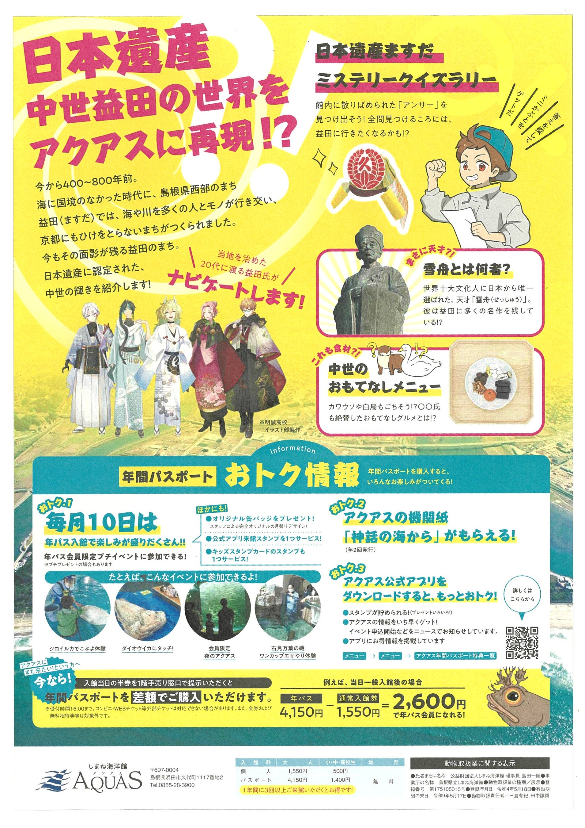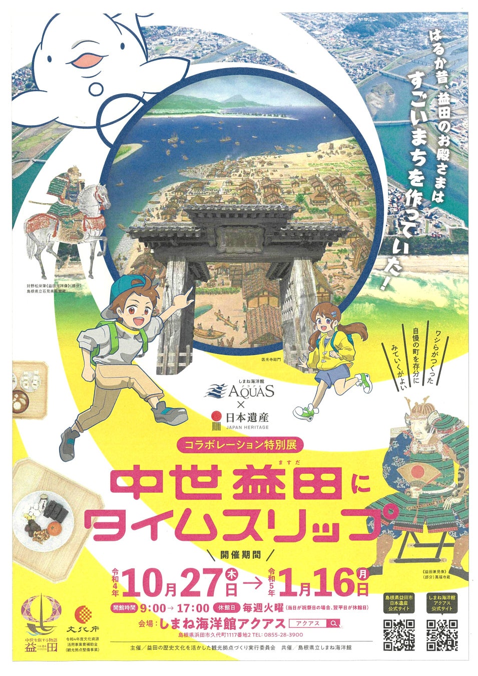 この度、益田市の豊かな歴史文化を活かした地域・観光振興に取り組む「益田の歴史文化を活かした観光拠点づくり実行委員会」と、豊かな海洋自然の大切さの普及啓発に取り組む「アクアス」が連携し、海・山・川がもたらした中世益田の繁栄をテーマに特別展『中世益田にタイムスリップ』を開催します。