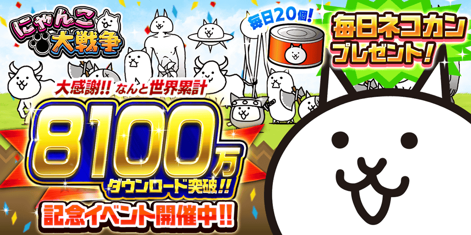 ・イベント開催期間中に「にゃんこ大戦争」アプリを起動すれば、毎日ネコカン20個プレゼント!