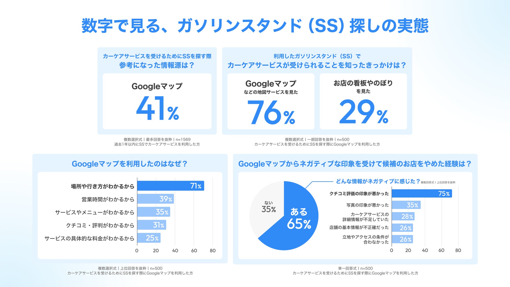 消費者アンケートの結果、カーケアサービスを受けるためにガソリンスタンド(SS)を探す際、多くの消費者がGoogleマップを参考にしていることが明らかに。