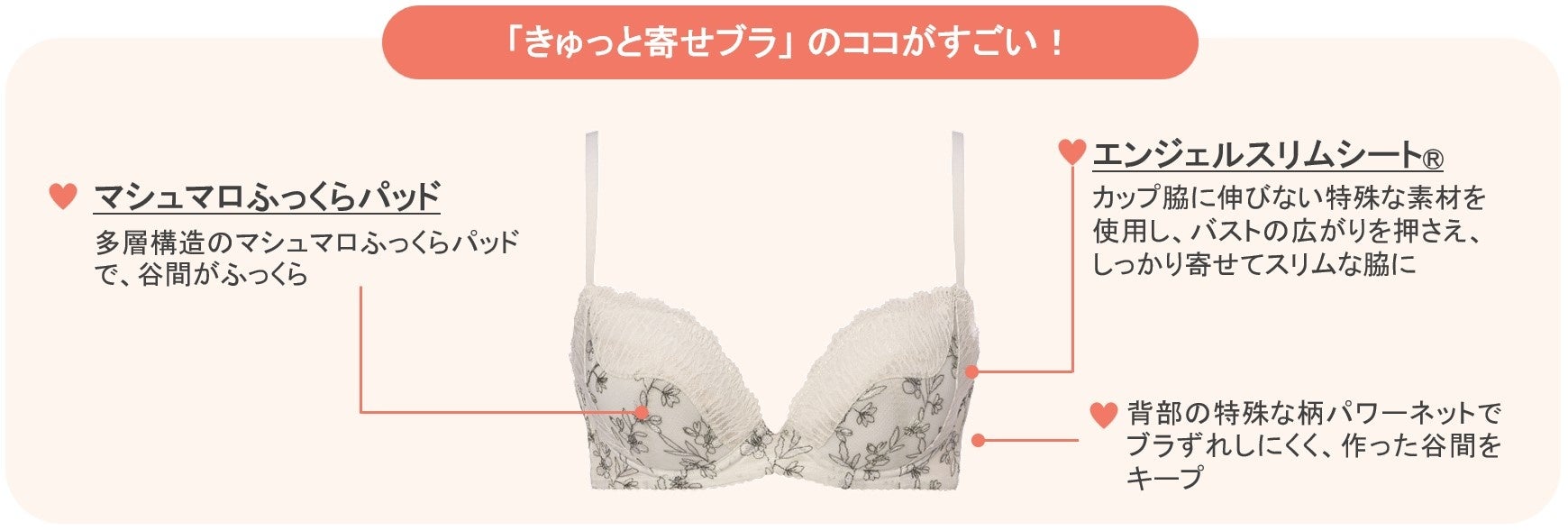 カップ脇の伸びないエンジェルスリムシート®で、脇からバストをしっかり引き寄せてキープし、取り外し可能なマシュマロふっくらパッドでボリュームアップ!くっきり美しい谷間をメイクする、その名の通りの“きゅっと寄せ”が特長。背部には特殊なパワーネットを使用、下辺には肌あたりのソフトなノンスリップテープを採用したズレにくい仕様です。すっきりとした脇と、作った谷間とのメリハリ感でスリムに魅せます。
