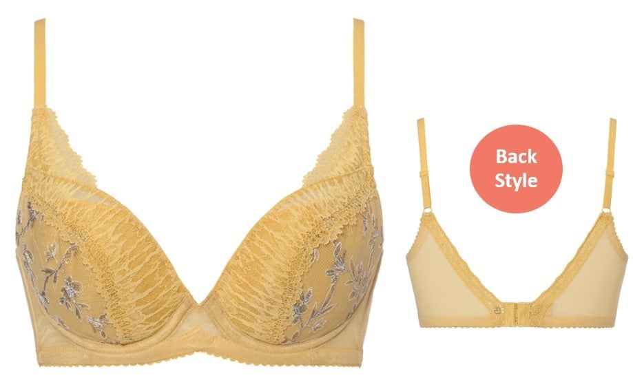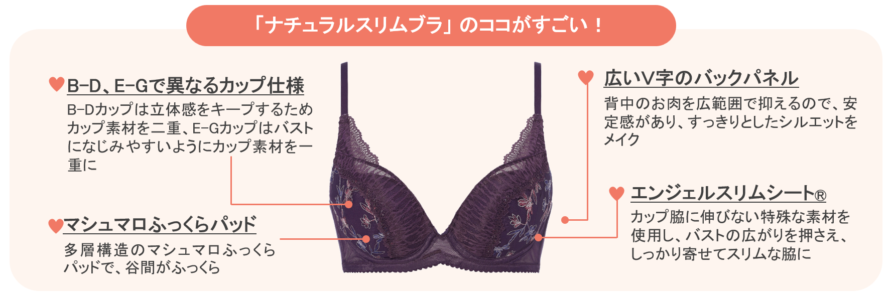 脇はすっきりスリムに、バストはナチュラル&きれいに魅せたい!そんな声に応えて登場。B-D、E-Gでカップの仕様を変更し、どのサイズも強調し過ぎない、丸みのある自然なバストシルエットに。さらに広いV字のバックパネルで背中のお肉を広範囲でおさえて安定感をアップ。カップ脇は伸びないエンジェルスリムシート®でしっかり寄せてスリムに整えます。