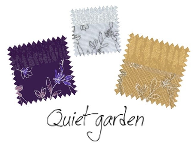 日本庭園の植物や生け花をモチーフにした刺しゅうレースと、水の流れる様子を描いた「枯山水」のような模様の編みレースをミックスし、日本ならではの美をモダンにアレンジしました。今紫(いまむらさき)、芥子色(からしいろ)、月白(げっぱく)と、日本の伝統色をイメージした、和を感じさせる優美なカラーで展開します。