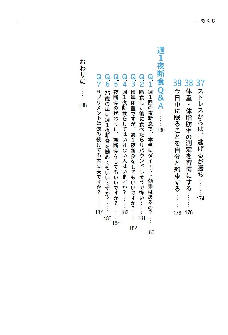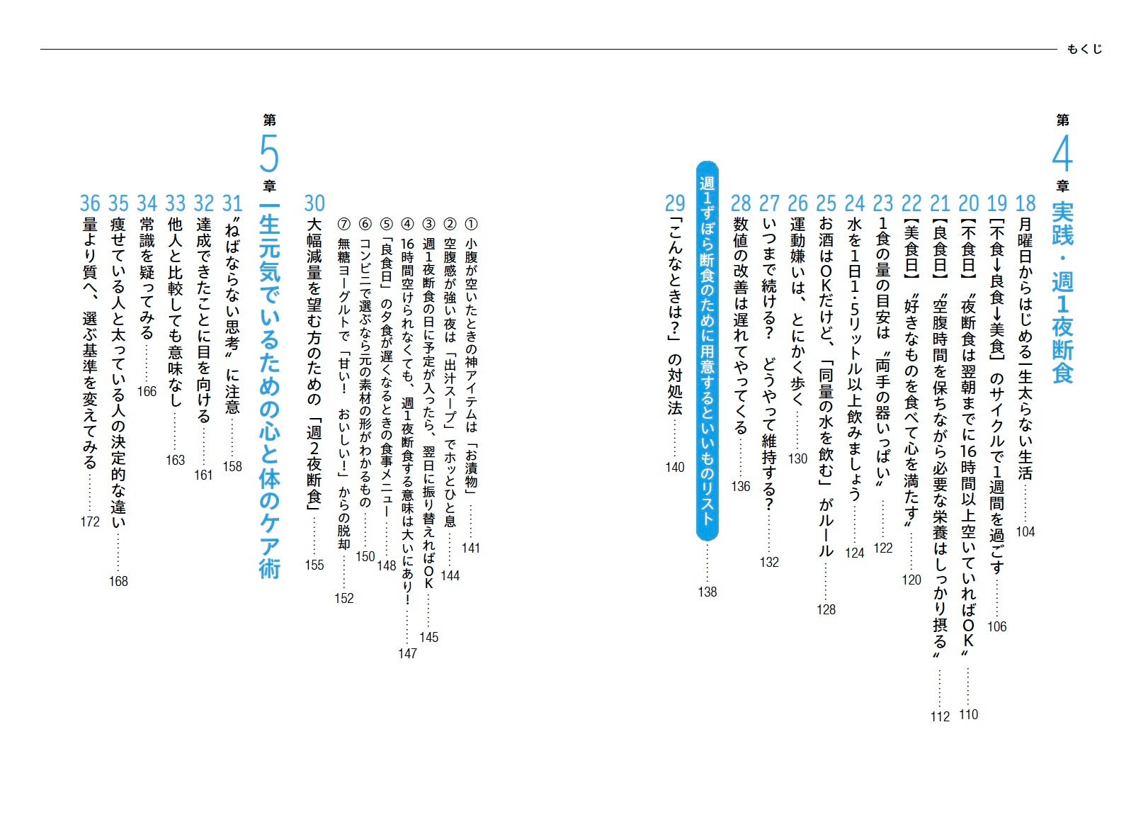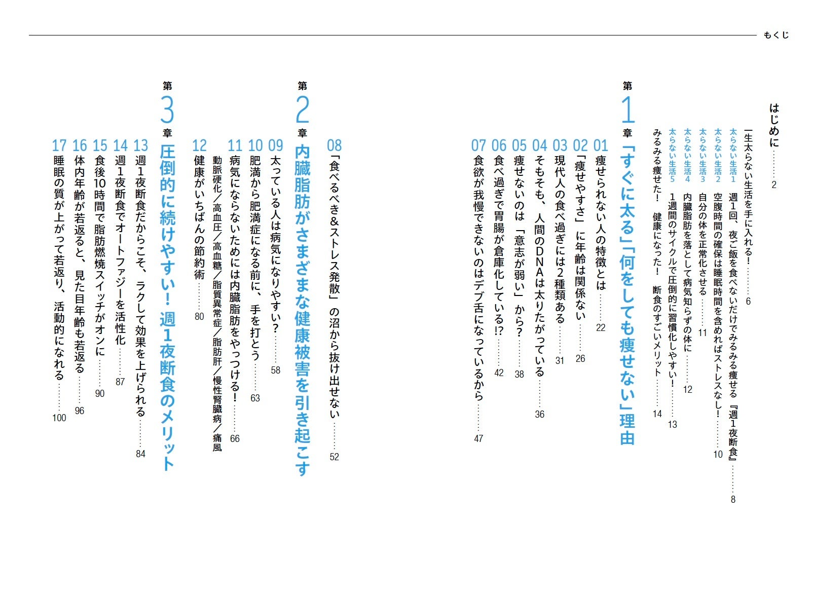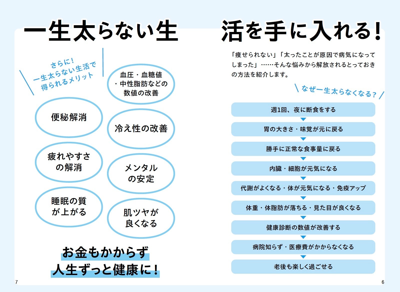 ダイエット法は数多くありますが、方法として圧倒的にシンプルな【週1夜断食】を紹介する一冊です。激しい運動なども一切必要なく、色々と栄養素を考えながら行う食事制限とも違って、シンプルに夕飯を抜くだけなので、年代問わず誰でも簡単にでき、お金もかかりません。また、他のダイエット法と比べて『胃の大きさが正常に戻る』『味覚が正常化して濃い味付けがいらなくなる』など、その後の食事法も変わります。誰でも簡単に健康になって、一生太らない生活を続けることができる一冊です。
