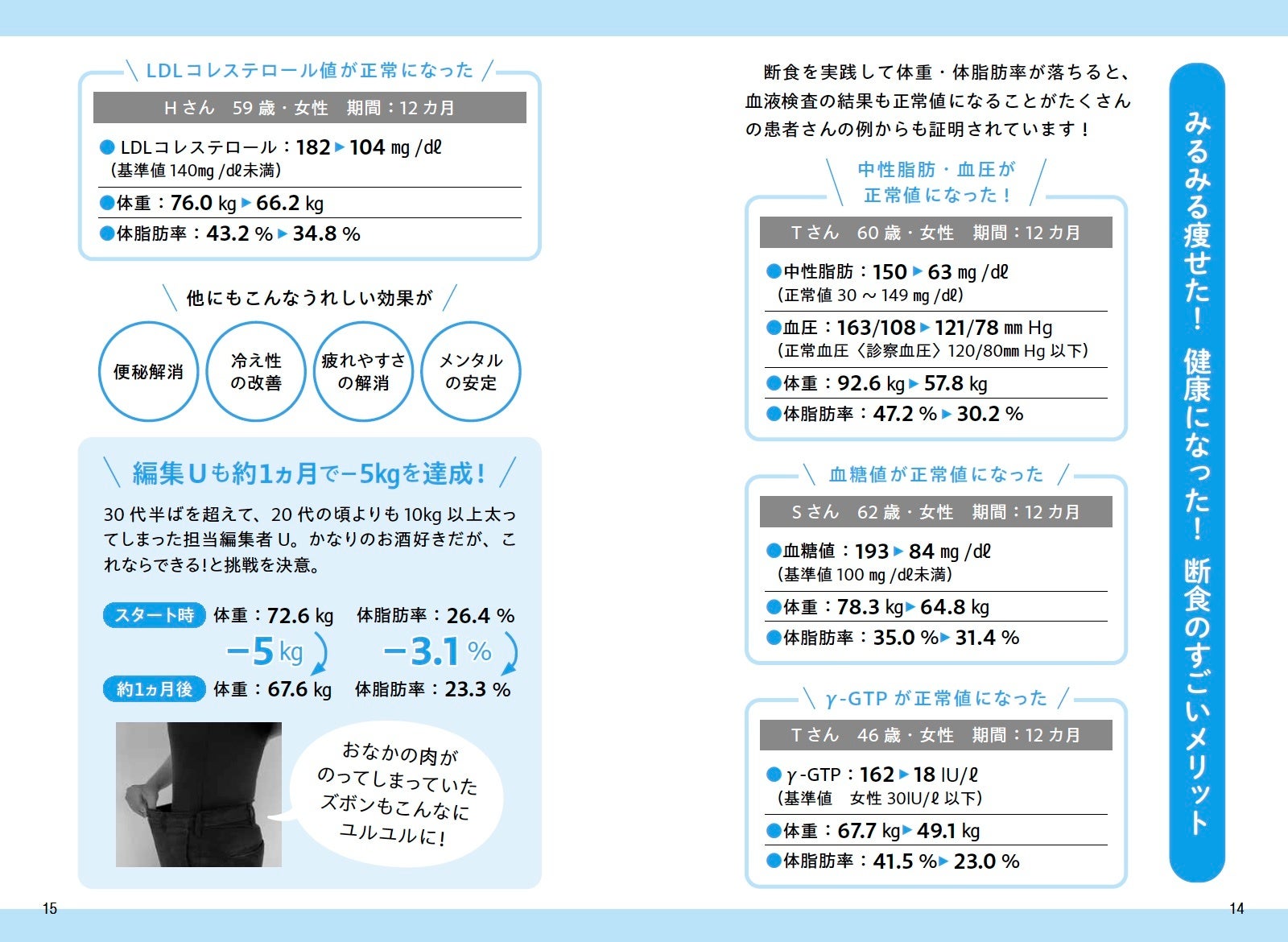お金も時間もかからず、週1回夜に断食をするだけなのに圧倒的なダイエット効果があり、驚くほど体調もよくなって、健康診断の数値もみるみる改善していきます。激しい運動なども一切必要ありません。