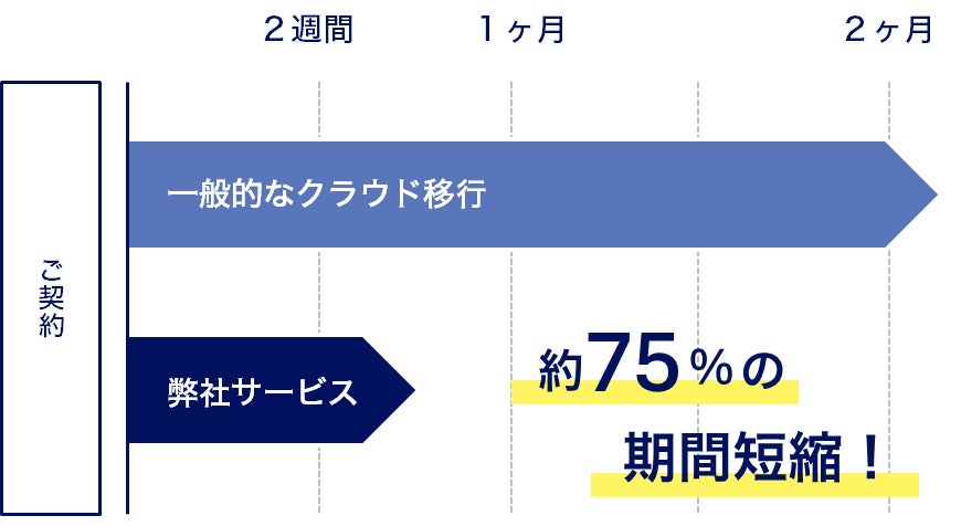 一般的なクラウド移行では、要件定義から環境構築、セキュリティ対策など、必要な項目に対してそれぞれ調査・検証も行うため、移行完了までに2,3か月を要する場合があります。