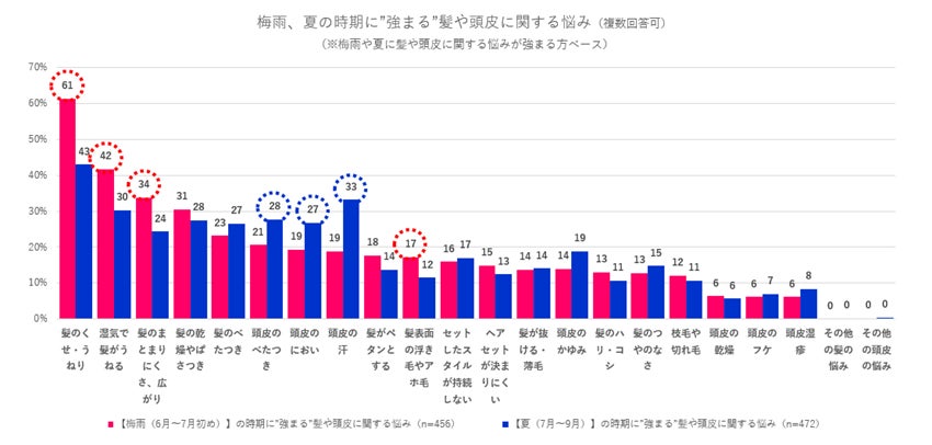 夏(7月~9月)には、「頭皮のべたつき」「頭皮のにおい」「頭皮の汗」といった頭皮の悩みが特に目立ちます。紫外線や汗の影響で頭皮環境が悪化しやすく、髪のボリューム感や質感の低下が夏特有の課題として挙げられています。これらの悩みは、夏の強い日差しや高温多湿な環境がもたらすダメージが主な原因とされています。