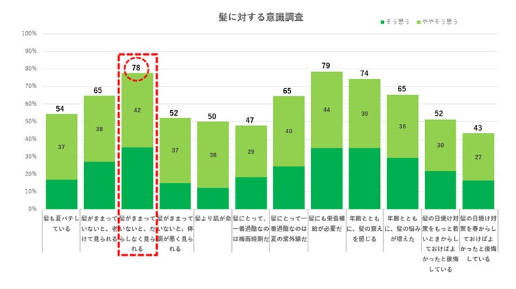「髪がきまらないと、だらしなく見られる」と感じる人が 78% に達し、また夏の髪と頭皮の自己評価は平均 60.7点 と低い結果となりました。特に20~30代の女性や、ロングヘアやミディアムヘアの方が自己評価を低くつける傾向があり、髪悩みが単なる美容上の問題にとどまらず、自信や日々の気分にも影響を与えていることがわかります。