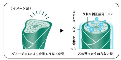 うねり補正成分※2が髪の芯に、コントロールコート成分※3が髪表面にアプローチします。髪の芯と表面にアプローチすることで、ダメージを補修しながら質感を整える独自技術です。 ダメージ※4でうねった髪1本1本の質感を改善※5し、ハリ・コシのあるしなやかな髪へと導きます。