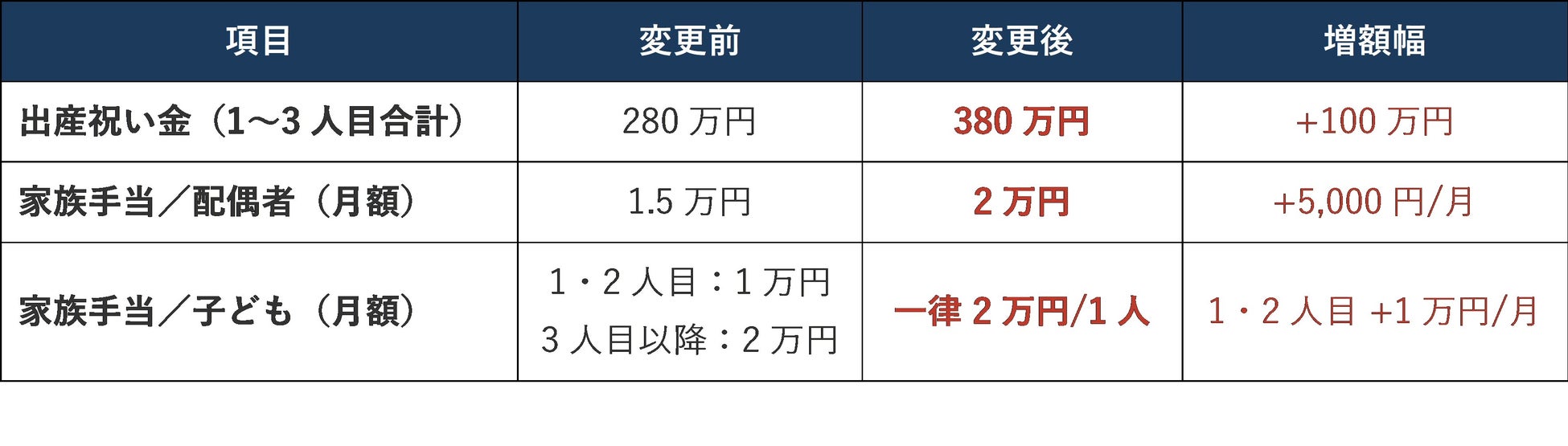 出産祝い金の一般的な相場は1万円前後とされるなか、当社グループでは従来より1〜3人目の合計で280万円という水準を設定してまいりました。今回の拡充では合計額を380万円に引き上げるとともに家族手当を全面的に増額し、「社員の家族を会社全体で応援する」姿勢をより明確に打ち出します。