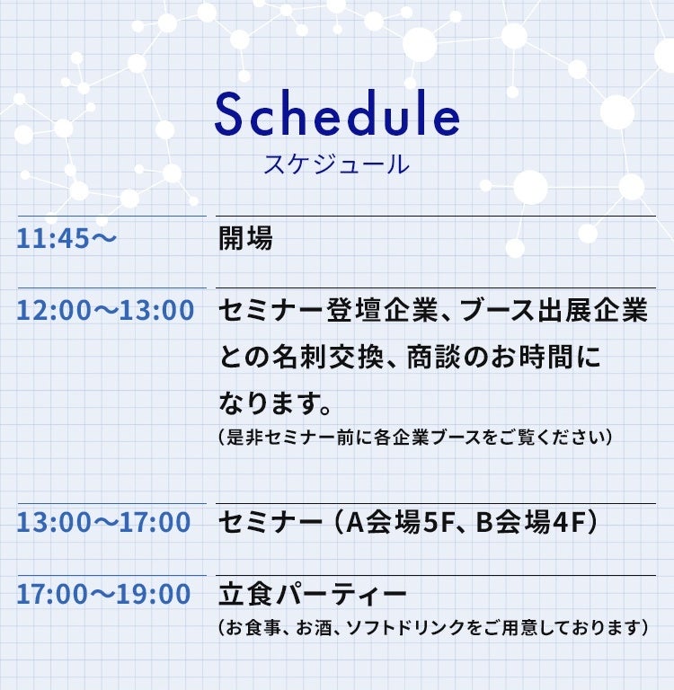 ・12:00~13:00 セミナー登壇企業、 ブース出展企業との名刺交換、商談