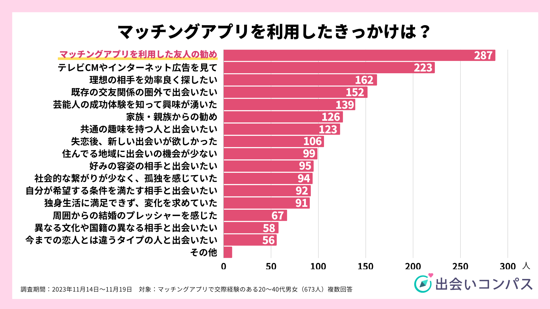 その結果、最も回答数が多かったのは「マッチングアプリを利用した友人の勧め(287人)」で、全体の42.6%が、既に利用している友人からマッチングアプリの利点やアドバイス等を聞いて、使い始めたことが分かりました。