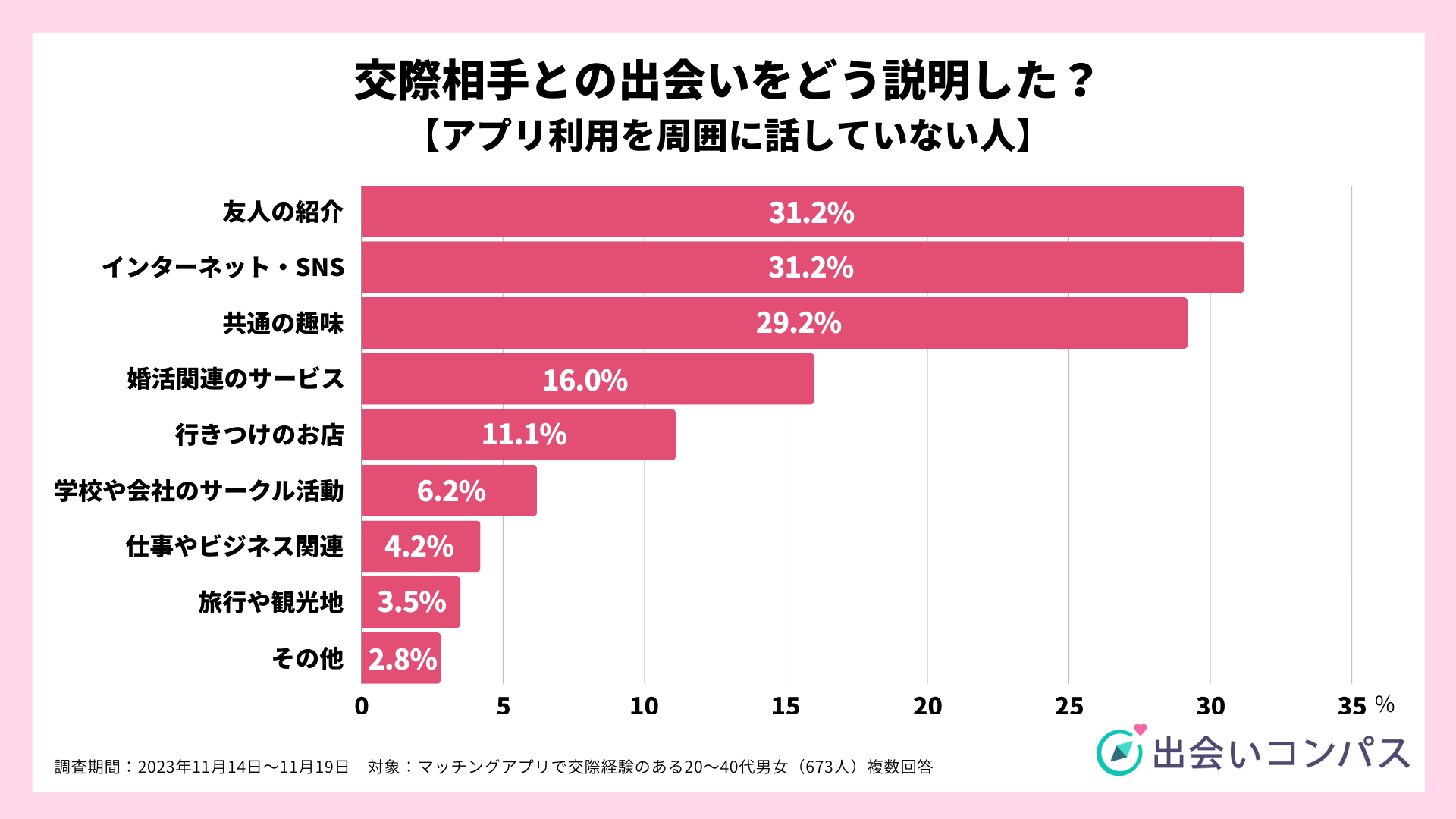 マッチングアプリの利用を周囲に話していない人の31.2%は、きっかけを「友人の紹介」と説明