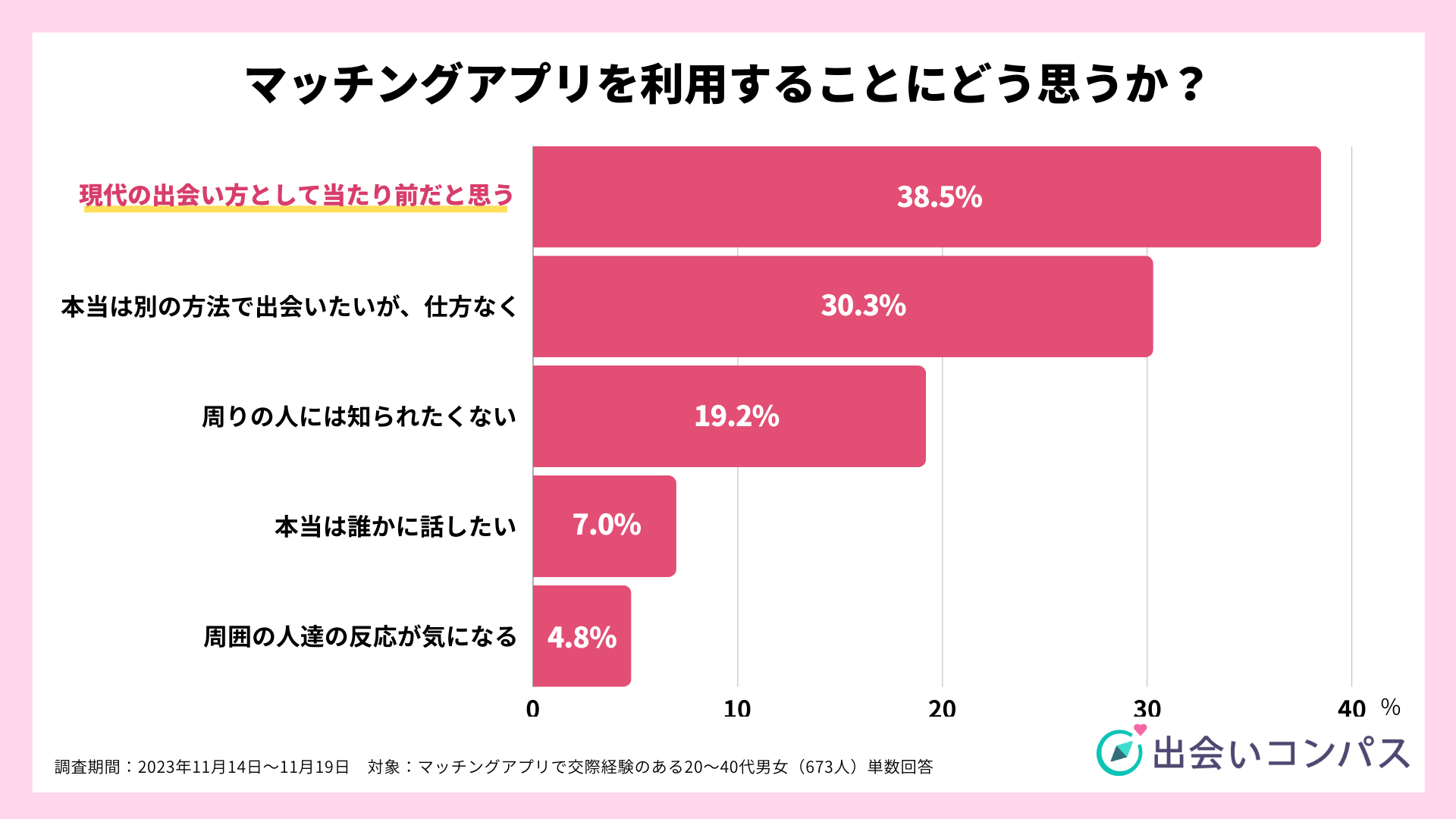 続いて、マッチングアプリを利用していることに対する考えを聞いてみたところ、「現代の出会い方として当たり前だと思う」がトップで38.5%でした。