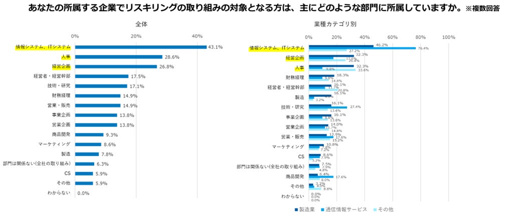 リスキリング施策の対象となる所属部門について尋ねたところ、「情報システム・ITシステム」(43.1%)がトップで、次いで「人事」(28.6%)、「経営企画」(26.8%)となりました。