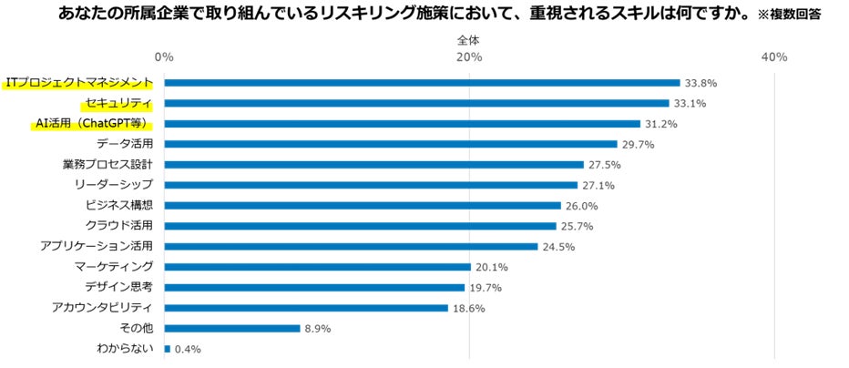所属企業が取り組むリスキリング施策において、「重視されるスキルは何ですか?」と尋ねたところ、全体1位は「ITプロジェクトマネジメント」(33.8%)、2位「セキュリティ」(33.1%)、3位「AI活用(Chat GPT等)」(31.2%)となりました。