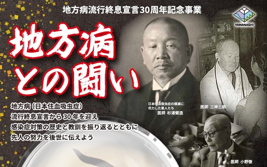 山梨県は、地方病(日本住血吸虫症)流行終息宣言から30周年を記念し、感染症対策の歴史をたどるシンポジウムを令和8年2月7日(土)、山梨県防災新館(山梨県甲府市)で開催します。約100年にわたり地域を苦しめた病の克服の歩みを振り返り、そこから得られた教訓を、これからの感染症対策にどう生かしていくかを、参加者の皆さまとともに考える機会として、専門家による講演とパネルディスカッションを行います。