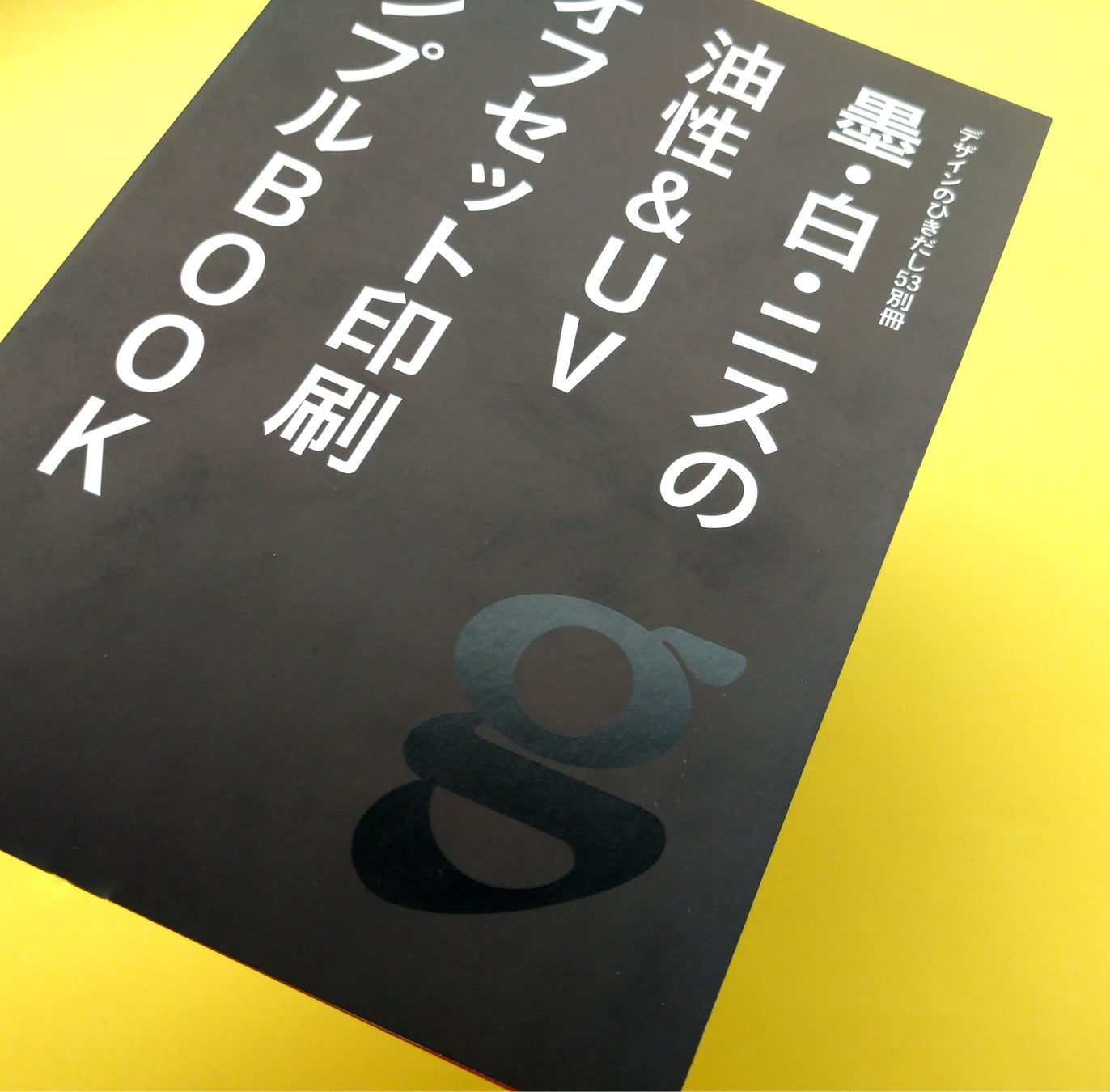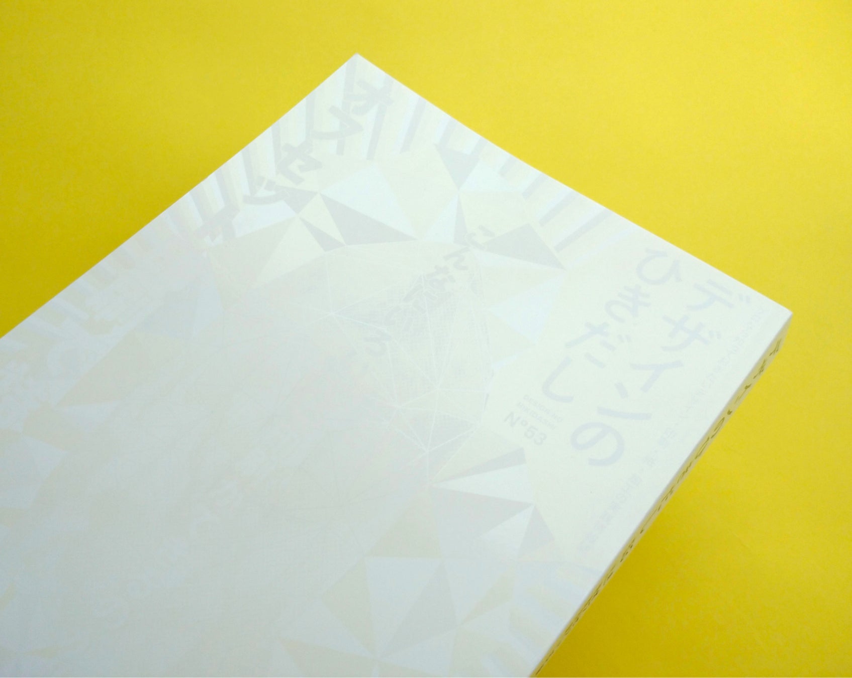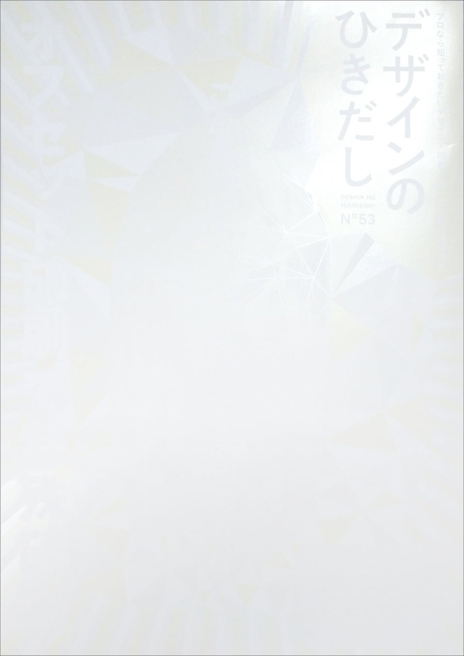 真っ白の表紙にびっくりした方も多かった『デザインのひきだし53』の表紙。光の加減で何かが見える…タイトルも見える…。これはすべてオフセット印刷によるものです。紙はNインバーコートG-FS(L判T目21㎏)を使用し、そこにUVオフセット印刷で透明的な特色を3色+プロセスブラックを印刷しています。
